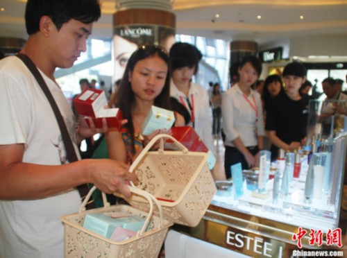 上午9时(假期比正常时间提前一个小时),游客开始按照免税店的规定,分批进入店内购物。游客们拿起购物篮,冲向柜台将喜欢的名牌商品放入篮中,然后一并拿去前台办理手续。