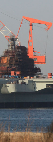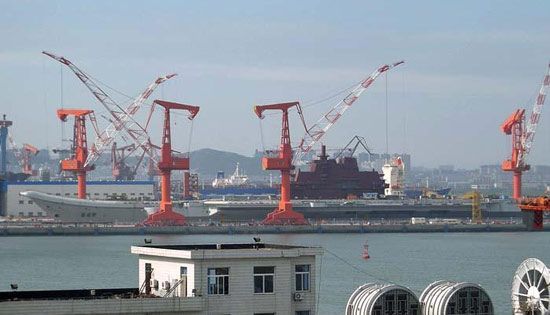 资料图:一些网络军事论坛纷纷登载了在中国大连造船厂改建的“瓦良格”号航空母舰的照片。