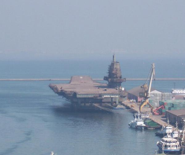 人民网资料图:停靠在大连港的“瓦良格”号航母。