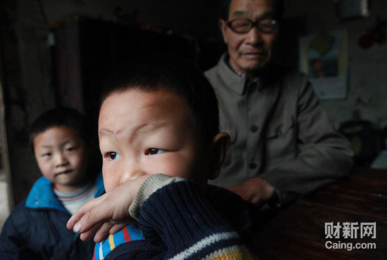 毛坪村的小男孩袁石(中),告诉记者,他的妹妹袁丽一岁的时候,被抢走了,至今下落不明。他想念妹妹,多次梦到她回家了。 财新记者李漠