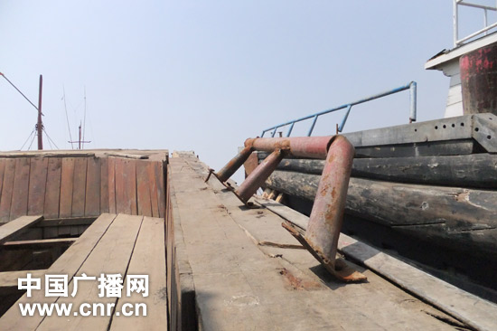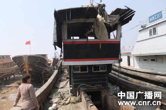 渔船冀昌渔5056号左侧船舷全部被撞坏(中国之声记者陈俊杰/摄)