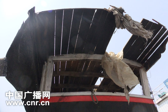 被撞的渔船冀昌渔5056号残破的船顶(中国之声记者陈俊杰/摄)