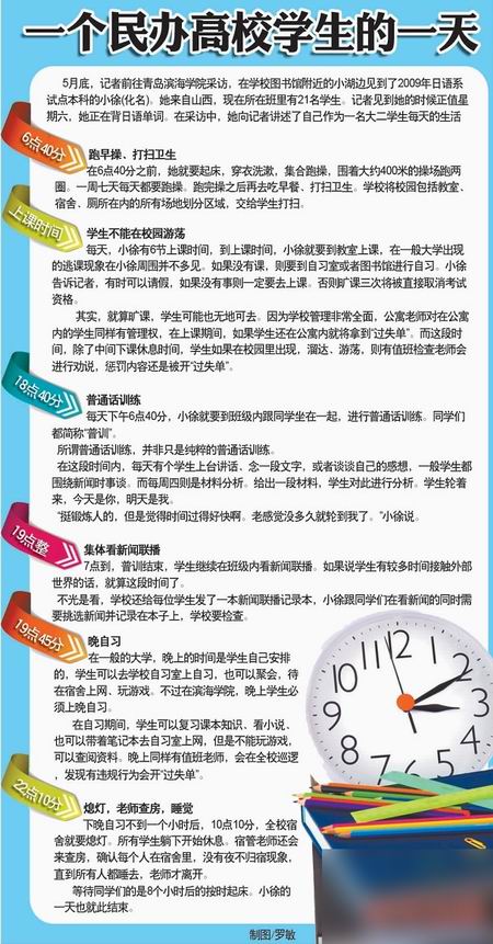 “ 这种学生管理方式实际上是因材施教。”谈到这个问题,青岛滨海学院学生处王处长却并不避讳。“首先,学校学生的层次摆在那儿,这个学校的学生与那些好大学的学生相比,学习成绩、自律意识都差一些。”王处长坦言,对于没有养成良好的学习习惯的学生来说,这种管理模式肯定是利大于弊。“如果真像公办大学那样,放开了,不管了,那很可能学生三年或者四年都学不到东西。学生也会形成一些非常不好的习惯,逃课、不吃早餐,男生沉溺于上网,女生倾心于装扮……学生自己肯定是喜欢这种管理方式,过得舒服,但是这实际上不是学生的理性需求。”