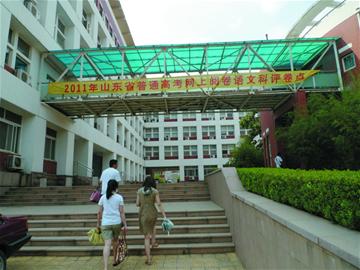 昨天下午,记者来到山东大学齐鲁软件学院,这里是高考语文阅卷现场,此处也是最早试点网上阅卷的地方。在一处教学楼前,记者看到,楼前悬挂出 “2011山东高考网上阅卷语文评卷点”的横幅,在评卷大楼楼下,有一名保安和老师看守,记者试图进入被拦阻,对方表示这里是高考阅卷点,没有工作证件任何人不能进入。
