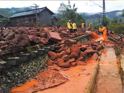 6月17日,救援人员在中断的铁路上进行排险作业。新华社发