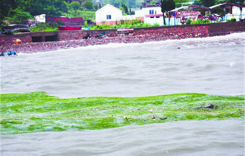 26日上午,强热带风暴"米雷"擦过岛城 ,部分浒苔随海浪漂向青岛海岸。