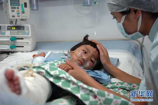 7月25日,护士在病床边对项炜伊进行心理安抚。当日,“7·23”甬温线动车追尾事故的最后一名获救者、年仅两岁零八个月的小女孩项炜伊在温州医学院附属第二医院重症监护室内接受治疗观察。据医生介绍,项炜伊的生命体征良好,但肺部、肝部及全身多处软组织挫伤,左下肢两个脚趾供血不足,院方将在观察其下肢血液循环的恢复情况后再决定是否需要截肢。 7月23日20时38分,甬温线北京南至福州D301次列车与杭州至福州南D3115次列车发生追尾事故。截至24日18时,该起事故中受伤人数上升到211人,死亡人数为35人。新华社记者黄宗治 摄