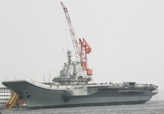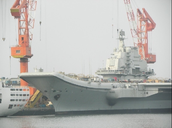 国防部宣布中国正在改造一艘废旧航母的消息发布的第二天,记者来到正在改装的瓦良格号航母附近,发现瓦良格号航母的甲板相比一个月前整洁许多,舰载机助降装置菲涅尔双棱镜已经安装到位,后半部飞行甲板着舰区已经画出,同时开始有大量海军人员列队在舰上熟悉环境,在记者现场观察期间,瓦良格号航母短时间内两次冒出黑烟(如图),说明动力系统正在抓紧试验,同时桅杆最高位置上的雷达天线一直不停在转动,到天色渐暗时,瓦良格号上依然挑灯夜战,继续处于施工状态。