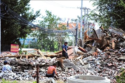 孟老太家的平房被拆后,工人在现场清理。