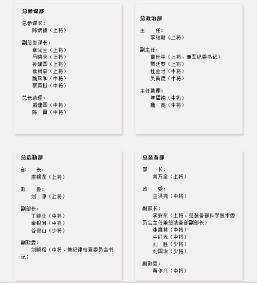 另外,原成都军区政治部主任吴昌德中将出任总政治部副主任,原国防科技大学校长张育林中将、拥有中科院院士头衔的刘国治少将出任总装备部副部长,原兰州军区副政委刘晓榕中将任总后勤部副政委、纪委书记。