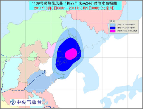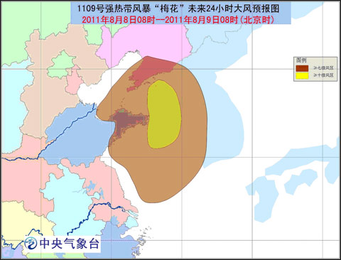 受“梅花”影响,8月8日08时至9日08时,渤海东部、渤海海峡、黄海大部以及辽东半岛及其沿海、山东半岛及其沿海将有7-8级大风,“梅花”中心经过的附近海面的风力有9-10级;山东半岛东部、辽宁大部、吉林南部等地有大到暴雨,其中,辽宁中东部的部分地区有大暴雨,局地特大暴雨。