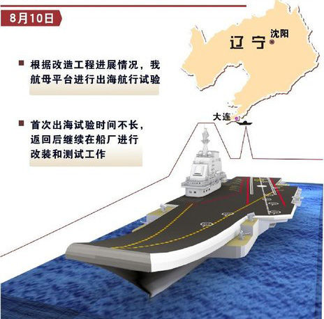 8月10日,中国航母平台进行出海航行试验。图为拍摄于大连的中国航母平台