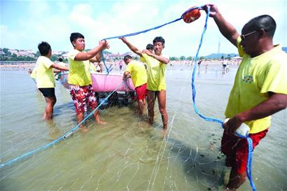 昨天上午11时许,记者来到第一海水浴场,此时,浴场的救生队员已经将备用防鲨网取出,经过晾晒之后,开始对防鲨网进行安装。虽然此时正值落潮,给安装防鲨网提供了方便,但海上的风浪依然不小,深水区防鲨网的安装有一定的难度。只见八名救生队员把已经选好的防鲨网放到小船中,推着船朝防鲨网原先位置的浮标绳走去。到达原浮标绳位置之后,两名救生队员负责将新浮标绳与原有的浮标绳固定在一起,其他救生队员则负责撑网。