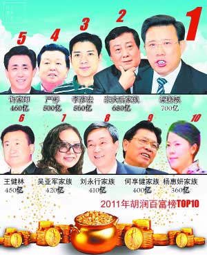本报讯 (记者 王刘芳)高房价在造就千万“房奴”的同时,也造就了大批富豪。昨天胡润研究院发布了新一期的中国富豪榜。这张榜单显示,在排名前50位的顶级富豪中,有27位涉及房地产业务;在排名前10位的巨富中,有5位涉及房地产;在排名前1000位的富豪中,有23.5%涉及房地产。