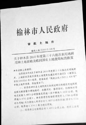 9月23日,记者在神木县国土局了解到,今年4月,陕西省政府以“陕政函【2011】75号”批准了该土地利用总体规划作为城市建设用地,县城规划已将该区域纳入新的城市规划范围。截至目前,该县共上报省市政府审批土地 5373.63亩,已供地 3448.605亩,正在建设或建成的项目均已取得合法用地手续。