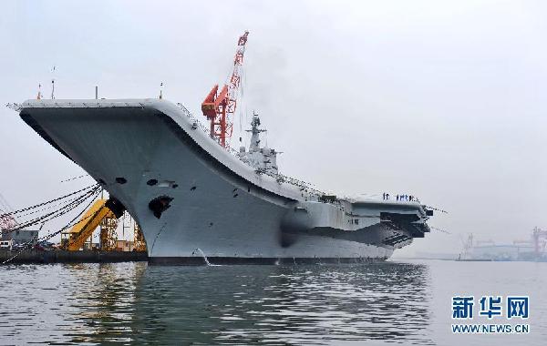 资料图:8月10日,中国航母平台进行出海航行试验。按照试验计划,首次出海试验时间不会太长,返回后将继续在船厂进行改装和测试工作。图为拍摄于大连的中国航母平台。新华社发