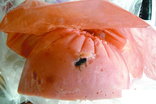 “火腿肠1日晚上吃了一些,然后放到冰箱里了。3日中午我从冰箱里拿出来,看到剩下的那一截表面有个黑点,挖开表层后发现里面竟夹着一只死苍蝇。”吕先生说。