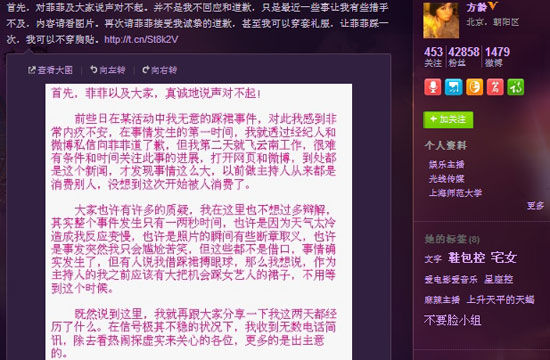 方龄在其发布的长篇文字中写道自己在事发的第一时间就透过经纪人以及微博私信向孙菲菲道歉了,后就飞往云南工作了。方龄解释自己并非故意踩孙菲菲的裙子,“作为主持人的我之前应该有大把机会踩女艺人的裙子,不用等到这个时候。”方龄表示自己之所以没有马上公开道歉是因为这几天经历了危机公关轰炸式的灌输,所以会反应有些迟钝。