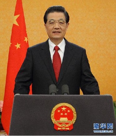 2012年的新年钟声即将敲响。在这辞旧迎新的美好时刻,我很高兴通过中国国际广播电台、中央人民广播电台和中央电视台,向全国各族人民,向香港特别行政区同胞和澳门特别行政区同胞,向台湾同胞和海外侨胞,向世界各国的朋友们,致以新年的祝福!