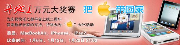 快乐之都棋牌平台为庆祝平台上线两周年,分别于2012年1月6日,13日,20日晚九点举办比赛赢iPad 2,iPhone 4,Apple/MacBook Air,每场暂订500人报名人参加,单场比赛更有3950元免费奖品,人人皆有机会,另外每天晚八点还有比赛赢实物,比赛赢Q币,牛牛赢奖池,德州抽奖等活动。新年伊始,快乐之都备年货,随便耍耍拿奖品!听说新年期间还有现金奖品,,,,,,还有,,,,,,你懂的!此外,特别提醒(快乐之都奖品兑换一律免邮费,首选顺丰)