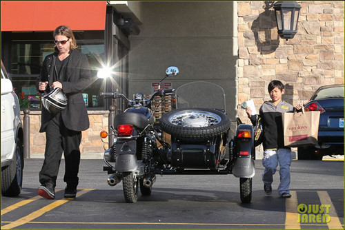 美国加州当地时间12月31日正值新旧年交替的时间,巨星布拉德·皮特也没有闲着,而是带着自己的8岁大的样子外出购物。当天的布拉德·皮特身穿一身黑色,而小儿子也是酷劲十足,爷俩骑着布拉德·皮特的复古摩托车到商店进行大采购,看来是在为新年值班年货。