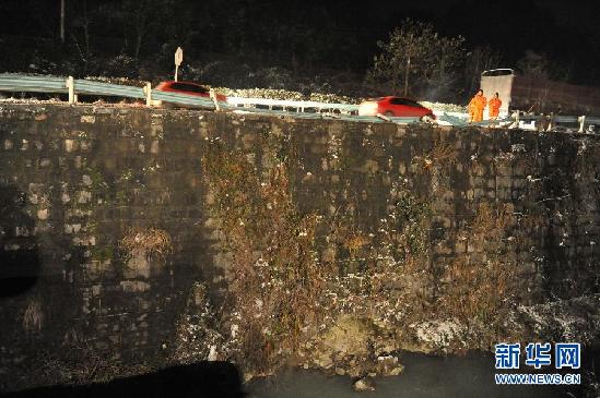 1月5日,救援人员查看翻车事故现场。兰海高速贵州境内贵定县到福泉市路段4日18时30分左右发生一起大客车翻车事故,至4日22时,现场救援工作基本结束,事故已造成16人死亡。(新华社记者 刘续 摄)