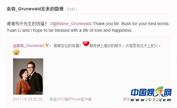 近日,突然闪电结婚的袁莉收到了来自美国前总统的祝贺,在微博上,袁莉高调感谢来自布什总统的祝贺。并表示期待穿上婚纱,举办婚礼的时刻。