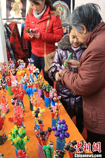 7日,2012年中国年货购物节在山东省会济南举办,“年货大集”上,鸡鸭鱼肉、茶酒油酱、南北炒货、糖饵果品,年货种类繁多,泉城百姓纷纷前来置办年货。图为一位小朋友在购买传统手工艺泥塑制品。陈庆芳摄