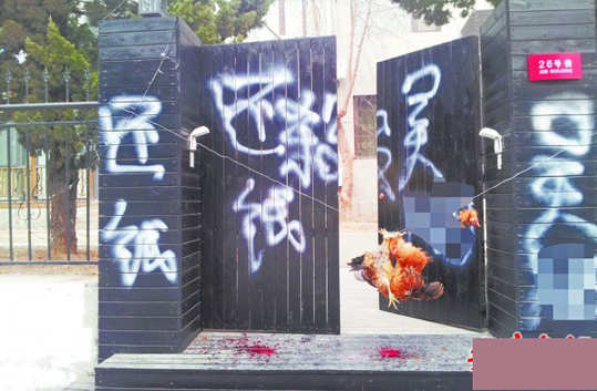 大院门口被喷了油漆,挂上死鸡。(李先生提供) 10日凌晨4时许,台湾路9号26号楼的院门口被人用白色油漆喷满“还钱”、“杀”等大字,院内也被投掷了多个“油漆弹”,更恐怖的是对方还在门口挂上了两只剁了头的死鸡,鸡血满处都是。门口监控录像显示,当时有3名蒙面男子在此处喷字挂死鸡。11日下午,在此处工作的李先生向记者反映了此事,并称已经报警。 11日下午,记者闻讯赶到事发地,这里是一个单位。此时大门上的油漆已经被清理,但门前的台阶上以及院内的走廊里还留有大片油漆印记。记者从李先生拍摄的照片看到,大院的两扇大门以及门框上被人用白色油漆喷上了“还钱”等字眼,其中有一个“杀”字,院门口还被人用铁丝穿了两只砍了头的死鸡挂在大门中间,两个鸡头也被穿在了铁丝上,地上、大门等处满是血迹,场面显得非常血腥恐怖。 李先生最先发现了这一幕。“10日早上我来单位上班,一进胡同就看到院门上被喷了油漆。”李先生说,当时发现门口挂着的两只死鸡还在滴血,他随后赶紧汇报给了单位领导。为了防止上班的女同事被这一幕吓到,他提前在胡同口处等候,并挨个提醒让她们有心理准备。即使这样,仍有两个女同事吓得没敢进大院,直接请假回家了,还有一个女同事提前下班了。 大院门口安装有监控,录下了喷漆过程,监控显示,是3名男子于10日凌晨4时许来到门口喷漆。“可能是夜间的光线不好,加上他们都戴着帽子并蒙着面部,根本看不清是谁。”李先生说。记者从监控录像看到,三名男子步行来到院门前,往院门上喷漆,接着三人用刀具将两只活鸡的鸡头剁了下来,把鸡和鸡头挂到了门前的铁丝上。一人拿出手电筒照着,另外两人竟还掏出手机拍照录像。临走时,他们还朝大院内扔了几个“油漆弹”。 李先生说,他们已经在事发当天报警,目前警方正在调查此事。该单位负责人吴先生的名字也被喷到了院门上,对此,吴先生说目前无法确定此事是谁干的,但根据“还钱”字眼,此事能确定怀疑对象。吴先生说,他是一名外地人,在青岛做生意很多年了,自己的单位此前跟青岛一家公司一直有一些经济纠纷没有解决,因此怀疑是对方所为。吴先生希望对方通过正常途径解决纠纷。记者了解到,目前警方正在对此事进行调查。 |
