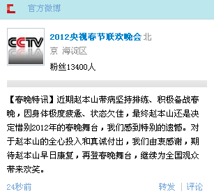 央视春晚剧组官方微博截图 中新网北京1月19日电(鲍文玉) 19日下午,龙年央视春晚剧组官方微博发布声明,由于赵本山身体极度疲惫,状态欠佳,将告别今年春晚舞台。 据了解,赵本山已经参加了三次带妆彩排,中间曾因身体欠佳曾吸氧20分钟才上台。现在此消息传出,徒弟小沈阳、王小利、宋小宝能否上春晚再成谜。 赵本山1990年第一次上春晚,与黄晓娟一起表演小品《相亲》,从此与春晚结缘。迄今为止,赵本山共参加了21届春晚,代表作包括《卖拐》、《不差钱》、《捐助》、《同桌的你》等。 微博原文:【春晚特讯】近期赵本山带病坚持排练、积极备战春晚,因身体极度疲惫、状态欠佳,最终赵本山还是决定惜别2012年的春晚舞台,我们感到特别的遗憾。对于赵本山的全心投入和真诚付出,我们由衷感谢,期待赵本山早日康复,再登春晚舞台,继续为全国观众带来欢笑。 |