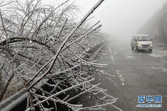 1月23日在京港澳高速粤北南岭韶关乐昌段沿途拍摄的冰雾景观。受强冷空气影响,广东正遭遇寒冷的春节。广东公路出省“咽喉要道”京港澳高速部分路段温度已经降至零下,粤北韶关乐昌段沿途能见度10米左右,雾锁南岭,道路结冰,行车缓慢。新华社发(李作描摄)