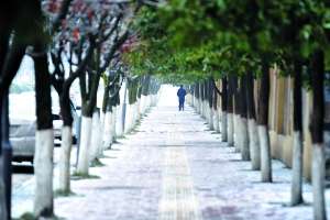 1月25日,一位行人从贵州开阳县的林荫路经过。持续的低温雨雪天气,已使贵州开阳县的道路上铺了一层薄冰。当日,贵州59县市区出现冻雨(小雪)和电线积冰,71县市区最低气温在0摄氏度以下。