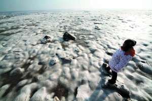 1月25日,一名小朋友在江苏海州湾北部赣榆近海的海冰上玩耍。受冷空气影响,江苏省海州湾北部被大面积海冰覆盖,近海渔船被海冰冻住。国家海洋局监测显示,春节期间,我国北部海区气温维持低值,渤海及黄海北部冰情有明显发展。(新华社发)