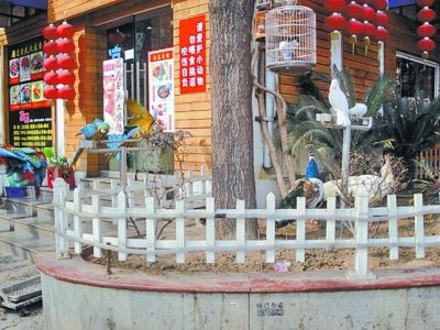 孔雀就养在临街的小院中 图/武汉晚报 本报讯(见习记者万凌)“我只在动物园里见过孔雀,没想到在武汉街头就目睹了一次孔雀开屏。太罕见了!”昨日,浙江的王小姐向本报报料,难掩兴奋之情。 王小姐称,春节期间她和朋友来汉旅游,昨天上午经过南京路,看到一家餐馆门前有孔雀、鸳鸯等珍贵禽鸟,一时激动不已,但又担心它们会不会有性命之忧? 昨日,记者来到南京路,找到王小姐所说的餐馆,看见外面的人行道上被低矮的栅栏围起一个院子,五只孔雀和上十只鸳鸯在里面散步或休憩,三只金刚鹦鹉也被锁在门口的铁架上,时而发出鸣叫。餐馆门上还贴了一张告示,写着“请爱护小动物,勿喂食挑逗,咬伤自负”。路人纷纷驻足围观并拍照。记者走进餐馆,发现菜单上都是些家常菜。 围观的市民刘先生说,去年偶然路过该餐馆就见过这些鸟,品种和数目跟现在差不多。 记者昨联系上餐馆老板,他自称晓斌,对于宠物鸟被围观一事,表现得十分淡定。据介绍,他养鸟近十年,大部分是从国外引进的品种,白天放在餐馆外面,是为了营造亲近自然的氛围,但的确有人被它们吸引后进去消费。他称已为其办理了合法手续。 个人能否在公共场所饲养珍贵禽类?对此,市林业局相关工作人员表示,根据《中华人民共和国野生动物保护法》的规定,禁止任何单位和个人非法猎捕或者破坏国家保护野生动物及其生存环境,驯养、繁殖、运输国家重点保护野生动物需持有许可证,个人不宜在户外驯养珍稀动物。 |