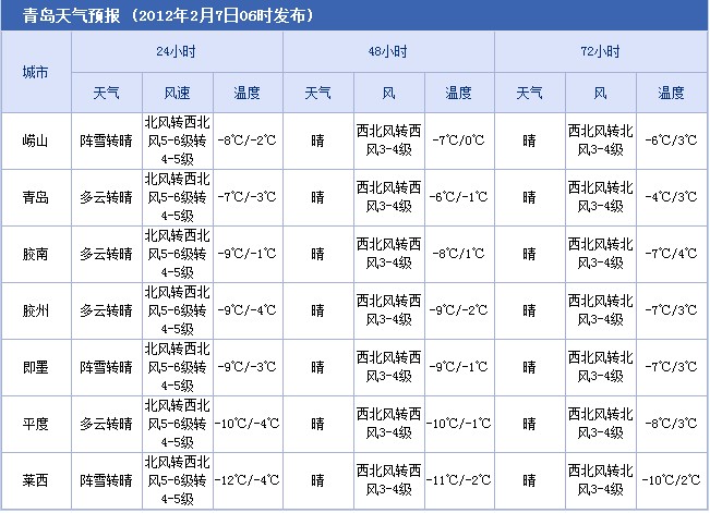 北方强冷空气来袭,青岛将迎来大风降温天气。市气象台昨日发布寒潮蓝色预警信号:受强冷空气影响,预计过程降温幅度将达8℃以上,7~8日早晨将出现最低气温,市区为-7℃左右,内陆地区为-10℃到-12℃。 据市气象台首席预报员介绍,从寒潮蓝色预警信号发布至今日,我市北风将逐渐增强到5~6级阵风8级,海上增强到7~8级阵风10级。请政府相关部门及广大居民注意防御寒潮,相关行业做好防风准备。(张华 凌艺) 今天气温“大幅跳水” 青岛发布寒潮蓝色预警 今天市区最低气温-7℃郊区-12℃后天起气温回升 昨天上午,青岛市气象台发布寒潮蓝色预警信号,我市北风将逐渐增强到5到6级,阵风8级,降温幅度达到8℃以上。昨天岛城最低温还在0℃以上,今天岛城市区最低气温-7℃左右,而郊区最低温将达-12℃。此次降温将一直持续到8日,9日起气温逐渐回升。 冷暖流“打架”雾朦胧 昨天一天,岛城都弥漫着雾气,除莱西部分地区达到大雾外,其余地区均为轻雾。“这是冷空气前锋抵达岛城后,同岛城上空的暖湿气流交汇形成的雾气。”市气象台首席气象预报员凌艺告诉记者,虽然岛城绝大部分区域被小雾笼罩,但并没有影响到道路的通行。在冷空气的持续影响下,岛城的雾气会在夜间散去,今天岛城不会有雾。 48小时内气温陡降8℃ 昨天上午9时,青岛市发布蓝色寒潮预警信号:受北方强冷空气影响,预计今天下午到明天,我市北风将逐渐增强到5到6级,阵风8级,海上增强到7到8级阵风10级,降温幅度达8℃以上。预计今明两天早晨最低气温市区-7℃左右,郊区-10℃到-12℃。 前天岛城最低温全天还在0℃以上,但今天岛城最低温就达-7℃。据凌艺介绍,立春过后,岛城前天迎来了龙年最为暖和的一天,市区最低气温全天都在冰点以上,这股冷空气的到来,将使岛城气温在48小时内至少降8℃。 今晨北部或有阵雪 “受冷空气的影响,今天凌晨岛城北部区域会有阵雪天气,不过降雪量不大,持续时间不会很长。”据凌艺介绍,这股冷空气带给岛城的除了强降温外,还有雨雪天气,不过市区出现雨雪的概率不大,出现在北部郊区的概率较大。 “这股冷空气的影响将在8日结束,岛城气温从9日开始回升,但升幅不大。”凌艺告诉记者,立春已过,岛城的气温总体进入升温阶段,但期间还是会有冷空气来袭,提醒市民注意添衣保暖;养殖户要对热带作物、水产品采取一定的防护措施。(记者 原野) 胶州湾海面又要上冻 预计发展趋势不会超过此前 10日左右进入消融期 受昨日到来的一股冷空气的影响,原本已呈消融之势的胶州湾、鳌山湾海冰将再次连成片。记者昨日从国家海洋局北海预报中心了解到,昨天下午至晚间冷空气到达后,可能会让消融的海冰再次出现,不过发展趋势不会超过此前情况,而且随着天气回暖,预计到10日左右,胶州湾和鳌山湾这两个海域会进入海冰消融期。 今年冰情比往年偏轻 今冬,青岛胶州湾鳌山湾海水出现多次冰冻、消融、再冰冻的情况:先是去年12月底,青岛海冰首现鳌山湾,随着气温走低,胶州湾近岸和滩涂也出现大范围海冰;1月中旬,随着气温回升,胶州湾、鳌山湾海冰逐渐消融;而2月1日一股冷空气的到来,使已基本解冻的胶州湾、鳌山湾再次“冰封”。3日起,随着气温走高,海冰很快再度消融。昨日,一股冷空气的到来再一次对胶州湾、鳌山湾形成考验。对此,北海预报中心中长期预报室副主任商杰介绍,海冰形成与水深地形、冷空气强弱、降温持续时间、降温幅度等因素有关,由于今冬的多股冷空气持续时间都不长,气温回升又较快,形成的海冰很快会变得酥软,进而逐渐消融。从目前情况来看,今冬胶州湾、鳌山湾的冰情比前两年都要偏轻。 10日左右进入消融期 “但进入2月以后,是海冰冰情最为严重的阶段,受冷空气影响,预计未来几天,渤海、黄海将迎来今年海冰冰情最高峰。”北海预报中心中长期预报室副主任商杰介绍说,从预报来看,这次冷空气带来的降温很明显,预计胶州湾和鳌山湾逐渐消融的海冰会再次出现,不过发展趋势不会超过之前的情况,最大冰厚不会超过10厘米。根据预报,这次冷空气过后,天气会呈现回暖趋势,预计到10日左右,胶州湾和鳌山湾会进入海冰消融期。(记者 于小阳) |
