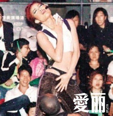 容祖儿,为了营造2005年演唱会的气氛,容祖儿施展浑身解数,和半裸男舞蹈员大跳热舞,一边临水一边自摸乳房,姿势极其挑逗和有人!