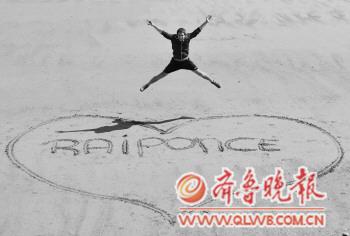 11日,在第三海水浴场,25岁的比利时留学生Greg在沙滩上画了一个大大的心形图案,里面写下了女友的名字。Greg来青岛已经4个月了,在沙滩上作画,是想拍成照片发给远在家乡的女友,以表思念之情。(记者 张晓鹏)