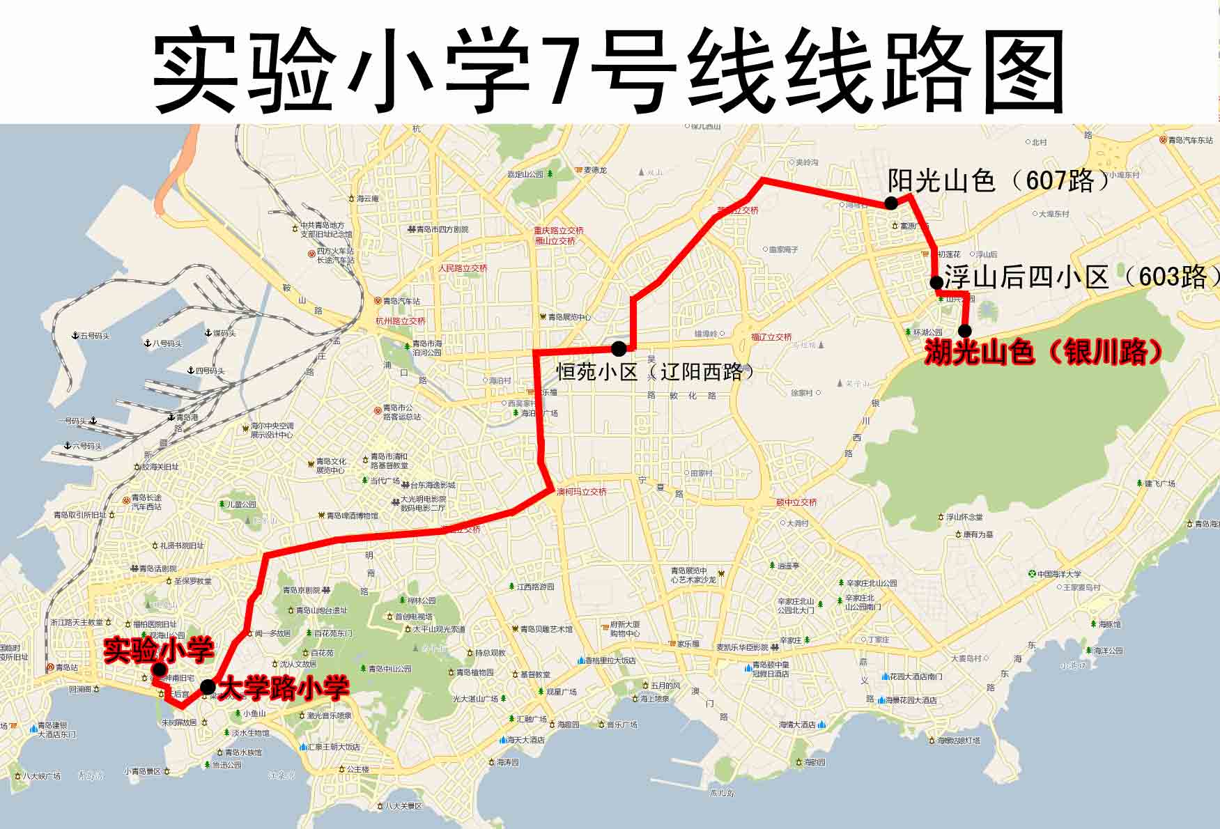 ①湖光山色(银川路)、②浮山后四小区(223路站)、③阳光山色(607路站)、④恒苑小区(辽阳西路),直达学校。