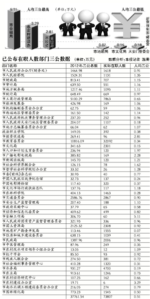![]() 昨日,北京今年要求公开部门预算的80家预算单位中,除市公安局、市交管局外,其余78家单位已经全部公布预算。近七成单位“三公经费”压缩。 其中,48个部门公布了在职人数,这48部门的人均“三公”为5100元。这是北京首次“晒”出人均三公支出数字。北京市金融工作局以人均“三公”5.11万元居首。 78部门已公开预算 从公布的单位数据看,有八成的预算总额都有所增加。而在“三公支出”方面,近七成单位有所下降。 78个单位的预算总额700亿元左右,“三公经费”近5.3亿元。而此前北京市公布的数据显示,2012年,全北京市级公共财政预算支出2295.1亿元;市级党政机关、全额拨款事业单位“三公经费”财政拨款预算安排11.2亿元。 对于其他5.9亿元“三公经费”用在何处,市财政局表示,北京一级预算单位就有168个。此次公布的部门预算,是提交市人大常委会审议的80个部门,而不是所有单位。北京的预算公开要做到所有单位公开,还需要一个过程。 公车占三公超一半 这78个部门公开的“三公”经费,均同时包含2011年、2012年两年的数字。近两年,78个部门“三公”总支出均超过5.2亿元,今年的“三公”总数比去年减少了303.49万元。 记者看到,在今年公开的“三公”各项支出当中,公车运营与维护的费用占据了最“大头”,共计29420.32万元,相当于“三公”总数的一半多,占56%;其次是出国经费,共计12504.96万元,占24%。 “三公”首次可横向比较 在78个公开预算的部门里,有48个部门在其预算说明中,主动公开了人员编制情况和实际在职人员数量,这同时意味着人均“三公”支出公布。 据悉,这是北京人均“三公”首次“掀开盖头”,48个部门将可就“三公”支出进行“横向比较”。 比如,北京市教委今年“三公”预算最高,达10816.09万元;而北京市农村建设办公室的“三公”仅为19.71万元,后者仅是前者的零头。 但市教委是目前公开在职人数的部门当中,最为“庞大”的一个,有32092名职工,平均每人占有的“三公”支出是0.34万元;而北京市农村建设办公室是目前公开的在职人数最少的单位,只有6名在职人员;平均每人“三公”支出为3.29万元。(温薷 蒋彦鑫) 分析 人均“三公”最高超5万 最低仅700元 记者看到,在“晒”出人均“三公”的48个部门中,在职人数一共是73807人,“三公”经费总数37761.54万元。也就是说,这48个部门中,每名在职人员占用的“三公”经费平均是0.51万元。 北京市金融工作局的人均“三公”,达到了5.11万元居首。根据该部门的预算说明,其在职人数共计60人,今年的“三公”预算总数为306.7万元。其中,该部门因公出国费用共计222万元,意味着每名在职人员平均享有3.7万的出国经费。对此市金融工作局解释称“今年由北京市在德国科隆举办金融合作论坛,致使出国经费增加”。 人均“三公”位居前五名的,依次还有北京市农村建设办公室、北京市投资促进局、北京市广播电影电视局、北京市人口计生委。 其中,北京市投资促进局的人均出国经费也比较高,达到了2.16万元。该局解释,今年将在香港举办第十六届京港洽谈会,需要增加4次前期赴港筹备工作,包括与香港相关部门研究洽谈会主题与工作方案;会议筹备小组派员勘查场地,预订会场及会议住所;与香港工商界召开座谈会搜集投资项目、筹备项目签约仪式;在香港举办新闻发布会。 最为“节俭”的部门,是北京市地质矿产勘查开发局。这个在职总人数1555人的单位,今年的“三公”支出为113.46万元,平均每人700元。天安门地区管委会、北京市文化局、北京市水务局也可谓“勤俭持家”,人均“三公”都没有超过2000元。(温薷) 个案 市民防局 1530万元整治地下空间 本报讯(记者金煜)市民防局预算显示,今年预算支出29190.81万元,其中,“地下空间综合整治项目”预算支出为1530万元。市民防局还对涉及国家秘密的而未公开的内容做出了说明。 民防局有涉密项目,民防局表示,根据国家保密局、北京市国家保密局有关规定,涉及人民防空项目建设经费为秘密级国家秘密,不予公开。 民防局项目支出增加较多,去年共有17项,今年增加到38项,其中,新增了“地下空间综合整治项目”,预算数为1530万元。 据悉,市民防局正在制订《北京市人民防空工程使用总体规划》,计划年内出台,该规划将严格控制散租户违规违法使用人民防空工程的现象。根据新规定,小区车库、活动场地、物质储备库等公共服务空间要留出来,除物业保洁保安管理范围内及一部分符合安全规定的旅馆之外,不可违法违规租给散租户。 以丰台为例,该区已完成对三环新城地下空间的综合整治,该区未来三年将整治476处地下空间,涉及租户10万人。 天安门管委会 广场大屏幕一年1600万元 天安门管委会公布的预算显示,天安门广场的LED显示屏一年的运行及维护费,达1600万元。 数据显示,天安门地区管理委员会全年支出预算23824.369711万元。 对于今年的项目支出方面,天安门广场LED大屏运行及维护费1600万元;国庆音乐会180万元;首都春节文艺联欢晚会520万元;天安门地区夜景照明费105万元;金水河喷泉运行维护费225.74万元。 在“三公经费”方面,2012年“三公经费”财政拨款预算204万元,比2011年增加近60万元;公车运营和维护145万元,其中公务用车购置费比2011年增加48万元,主要原因是2011年应报废更新公务车3辆。(记者 蒋彦鑫) 怀柔区 18个单位首次网上晒