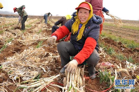 3月16日,山东省章丘市庆元村的农民在收获大葱。近期以来,受种植面积减少和不利气候因素等影响,市场上的大葱供应不足,价格持续走高,一些地区每斤大葱的价格超过了5元钱。作为我国大葱主产区之一的山东省目前尚有一定数量的越冬大葱保存在葱田里。3月中旬以来,气温明显上升,山东各地葱农利用气温回暖、土壤解冻的有利条件开始大量收获越冬大葱,供应市场。