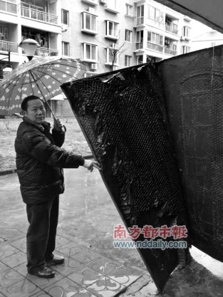 一名灾民拉开安置房的单元门,两块铁皮里面夹着的是纸板。