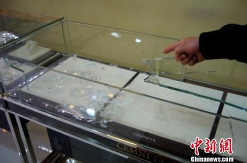 被敲碎的柜台上玻璃残片到处都是。 贾宏伟 摄