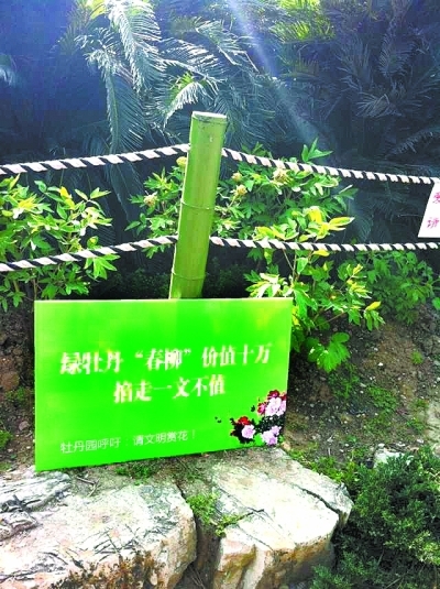 昨日,园方不得不临时赶制一块警示牌,告诫游客“绿牡丹春柳一株价值十万,掐走一文不值”;同时安排两名工作人员在绿牡丹旁守护。