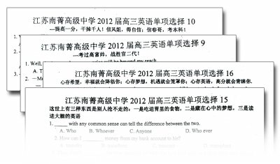 ![]() “提高一分,干掉千人!信凤姐,得自信;信春哥,考本科!考过高富帅,战胜官二代!”网络上的流行语,出现在南菁高中的高三英语考卷开头,这让考生直呼“意外”,同时大家又觉得紧张的高三生活有了一丝喜感。记者昨天从学校了解到,对于出卷老师的创意,学校给予了充分理解与支持。 喜感试卷 网络潮语印在了考卷开头 这里的“春哥”还和校长有关 昨天,记者在其中一份考卷上看到,第一行字样“江苏南菁高级中学2012届高三英语单项选择10”表明这是该校高三班的英语练习卷之一,而紧接着的第二行就是一段让考生们意外的文字:“提高一分,干掉千人!信凤姐,得自信;信春哥,考本科!”试卷的主要内容是15道常规的英文测试题。 这样印有网络潮语的试卷不止一份。同样的格式,其他卷子上也印上了或正儿八经的激励语句或充满喜感的网络潮语,如“心存希望,幸福就会降临你;心存梦想,机遇就会笼罩你;心存英语,高分就会青睐你。”“这世上有三样东西是别人抢不走的:一是吃进胃里的食物,二是藏在心中的梦想,三是读进大脑的英语。”“考过高富帅,战胜官二代!” 在扬子晚报记者采访时,有同学表示,自己刚拿到卷子的时候吓了一跳,以为发错了卷子,或者谁在印刷中做了手脚,这么严肃的英语试卷,怎么可能印上这种“非主流”的语言?“当时试卷发下来时,大家都很惊诧。很快大家都寂静了下来,确信自己的眼睛没有看错。” 学生反响 从惊诧到淡定,做题心情轻松了 连低年级的同学也希望试卷变得喜感 励志名言倒很常见,而“春哥、凤姐”之类的新潮网络流行语,显然把这所中学的学生们欢乐地“雷”到了。 学生们对这样新颖的鼓励方式也都纷纷“顶起”,“老师们真可爱,”“我们都是这种所谓的时尚话了啊啊啊啊啊,”“老师们和我们是一样的,都在压抑的日子里找乐子。”有同学表示自己的这届老师特别有喜感,和同学们的距离拉得很近。 这些试卷除了在高三年级的学生中引起了很大反响,很多低年级的同学对此也很有兴趣,甚至希望他们的试卷也能这么充满喜感。 据参与出题的吴红芬老师说,以往有时会在考卷上写一些励志名言,以激励学生的斗志。现在老师们把网络用语写在严肃的考卷上,本意是让学生们轻松一下,能够更加精神饱满地面对紧张的高三生活,缓解学生们的紧张情绪。 显然老师们的用意得到了良好的回应。有同学告诉扬子晚报记者,在做这些试卷时,一点都不紧张,答题心情特别的轻松,做起题来也发挥出了自己的水平。 【“春哥”说】 开明校长力挺老师创意 “这也符合学校倡导的特色化教学思路” 记者了解到,“信春哥,考本科”除了是网络流行语外,在南菁中学它还有一个特殊的含义和该校的校长过建春有关。校长过建春在师生中有着极高的威信,却很平易近人。作为校长,他和同学们交流得比较多,深得同学们爱戴,大家私下都尊称他为“春哥”。考卷发下去后,这帮“90后”学生都会心一笑。 “老师们很可爱。”事后得知老师们给高考班的学生们出了这样一份试卷,南菁中学校长过建春也被逗乐了。他认为,老师们以人性化的方式与学生们沟通,值得提倡。 “对于学生们来说,即使身在高三,生活也不全是考试,考试也不全是分数。”过建春说,现在距离高考还有2个月时间,学生们的基础知识已经基本定型,更多地需要宏观知识的整理和心态调整,需要学生们带着积极、乐观、略微紧张的状态投入学习。而个性话语的出现,也符合该校一贯倡导的特色化教学思路。 过建春校长表示,他是力挺老师们的创意做法,“要鼓励老师们用新颖、符合学生个性的方式促进学生成长。” |