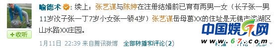 另据一位不愿表露身份的知情人透露,张艺谋确实早已结婚,生了三个孩子,长子张一男11岁,次子张一丁7岁,小女张一骄4岁,“可以派人去当地查,当地人都知道,岳母以此为荣,经常跟人炫耀。”而早前也有微博认证为“法制晚报文娱记者喻德术”的微博曾收到曝料短信,内容与何珺的曝料基本一致,并附有曝料中所谓的“岳母”葛XX的在无锡的地址。