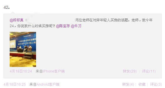 陈宝存微博截图 18日,有网友请教亚太城市发展研究会房地产分会会长陈宝存,今年24,何时买房?陈宝存回复称42岁,并称很多大佬,如任志强、王石都是42岁买房。引起网民热议,有网友看到42这个数字瞬间泪流满面。也有网友反驳说:“他在我们这个年龄没有我们现在这种经历,立场不一样,他不可能给出好答案。” 陈宝存称,买不起房是常态,租得起房是政府责任。应该采用货币补贴的方式 以下为部分网友观点: 京华秋雨:我有很多朋友本来是想先租房后买房的,因为工作什么的存在很多不确定性。但问题的关键在于国内的房价涨幅完全不可预测,胡涨乱涨,导致很多人心里不淡定了,才导致很多人拼全家之力买房。其实,如果房价涨幅平稳,涨其实也没什么。也就是说,只要给大家一个平稳的预期,房价涨老百姓其实并不是那么害怕。 神马NICK:5000一个月的房租,一年6万,400万可以租66年。我们的房子产权70年。 早早晚晚:房子这东西是重要,但为了它做奴隶值得吗? 徐正伟-等雨:有啥可泪流满面的,有房住不就好,管他买的还是租的。 吕语书年:如果这样,理论上讲42买房、43结婚、44生孩子、50带娃上小学、60上高中、70可以挂了。 热狗的围脖:我建议35左右岁买。其实不是啥时候买的问题,而是是否房价稳定,与收入比例是否协调,是对未来的奋斗有希望的心理预期的问题。毕业就买房,肯定不现实,便宜也买不起。 曾经的小幽:租房不能过日子吗?非要买什么房!中国人的诟病,好面子,再加上一些媒体的炒作,搞得好像没房子生活就没有了意义一样。如果我42岁的时候,我五年的纯工资不能买到房子,那我宁可这辈子不买房子。 Edison_GFS:哪个国家老百姓能随便买房?即使高收入国家的白领也是用一辈子的时间供一套房子而已。(东方网) |