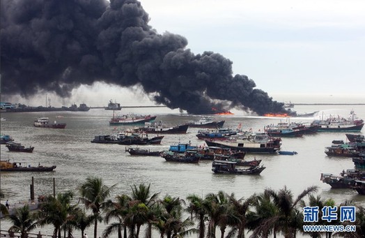 4月23日下午2时30分,珠海香洲港内一艘油船突然爆炸起大火。1小时后船上大火基本扑灭。不料慢慢下沉的尾舱却渗漏出大量柴油,导致二次起火,并随风浪延至香洲客运码头,码头航班被迫停运。