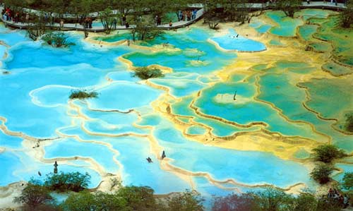 黄龙风景区位于四川省阿坝藏族羌族自治州松潘县境内,主景区黄龙沟位于岷山主峰雪宝顶下,主要因佛门名刹黄龙寺而得名。它是一条长约7公里,宽约300米的钙化山峡,这里山势如龙,又称“藏龙山”。黄龙以彩池、雪山、峡谷、森林“四绝”著称于世,是中国唯一的保护完好的高原湿地。这一地区还生存着许多濒临灭绝的动物,包括大熊猫和四川疣鼻金丝猴。