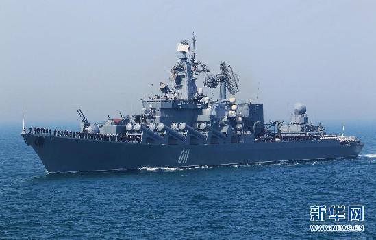 4月26日,俄罗斯海军“瓦良格”号导弹巡洋舰接受检阅。当日,参加“海上联合-2012”中俄海上联合军事演习的双方舰艇、飞机在青岛附近黄海海域举行盛大的海上阅兵仪式。这次海上阅兵主要包括舰艇19艘、飞机19架,采取海上分列式的方式依次通过阅兵舰接受检阅。海上阅兵是“海上联合-2012”中俄海上联合军事演习的第三阶段。此前,中俄双方已经进行了作战筹划、实兵演习等课目的演练。(记者 查