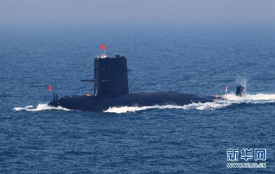 4月26日,中国海军潜艇接受检阅。当日,参加“海上联合-2012”中俄海上联合军事演习的双方舰艇、飞机在青岛附近黄海海域举行盛大的海上阅兵仪式。这次海上阅兵主要包括舰艇19艘、飞机19架,采取海上分列式的方式依次通过阅兵舰接受检阅。海上阅兵是“海上联合-2012”中俄海上联合军事演习的第三阶段。此前,中俄双方已经进行了作战筹划、实兵演习等课目的演练。(记者 查春明 摄